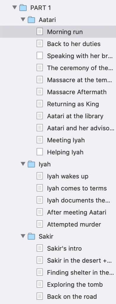 I used to be concerned with putting things in the correct order in the first draft, but what order they’re in right now doesn’t matter in the slightest. So instead what I’m doing now is grouping it into parts, then dividing it by character. So for example, these will all be mixed together when I edit later, and they’ll hopefully all flow into one another. But with 3 POVs, it’s much easier for me to write scenes in chronological order for each character. I also know which scenes have to happen in part 1, 2, and 3 for each character, and organizing my scenes this way helps me keep focused. To be clear, these aren’t even necessarily chapters yet. They average from about 1,200 – 1,800 words each (some far less), but I don’t consider them chapters at this point. They just mark important points in the story that need to happen. They’re not as fully organized and well thought out as chapters yet, and that’s okay! That will come later on.
