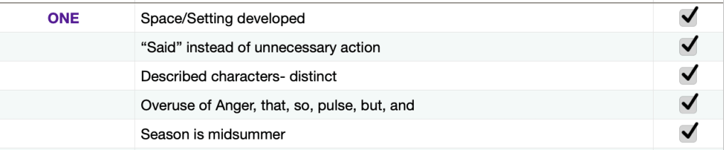 Did you notice a word you used to often? Maybe a gesture that is overdone? How about a character who had moments that they didn’t seem to be themselves? I take the notes from above and create an editing checklist for each chapter. In it, I might add more specific notes for certain scenes or chapters based on those plot holes I mentioned above. I then use this checklist for each chapter and check off those things I need to fix or search for. This way I will know when each chapter is done with all my boxes have been checked off. For Example: